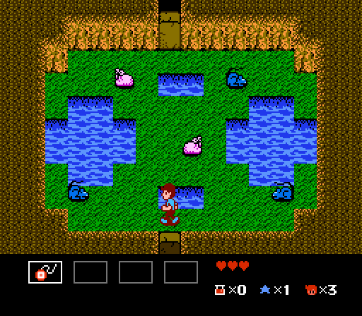 After a fairly easy start, the difficulty ramps up to ridiculous proportions. In a dungeon, if you die in any room, you’re thrust back to the beginning. This is par for the course, and very Zelda-like in structure. In Zelda, however, few, if any of the dungeons had rooms where you could be killed in one-hit. Enemies would take off half of a heart to a full heart, but all of your life? Even Ganon’s not that cruel. In StarTropics, there are an overabundance of one-hit kill rooms, thanks to the water or lava found there. If Mike jumps or lands in either of these liquids, he’s dead. You won’t go out of your way to jump into water or lava, but later dungeons are often structured around them. Makes sense, as the game takes place on a series of islands, but couldn’t Mike just lose one heart, like in Zelda? Couple the one-hit deaths with increasingly obnoxious enemies (the mummies that take a thousand hits!) and you have a difficulty spike that’s both jarring and unnecessary.
