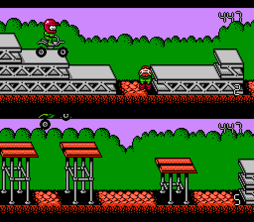 Nothing says “why God why” like a horrible unlicensed rip-off of Excitebike. Stunt Kids pits two stubby things (presumably children because they’re short, but they don’t appear human) against each other in a split screen duel to the motorbiking death; if you don’t have a second-player, an egregiously talented computer player will be provided for you. Despite the game’s moniker, there are no real stunts. If you can jump over the obstacles in each course while keeping your balance, you’re talented enough. Therein lies the problem: if you want to go fast, beat the clock and the CPU player, you’ll have to avoid every obstacle out there. If you hit anything, you’ll go flying off your bike, which shaves precious milliseconds off your time. Worse yet, it can be hard to gauge jump distances. Different courses have varying terrain with upward and downward slopes. When in doubt, it’s good to slant your bike upwards – if only because the computer does it so much, and they’re incredible. Your opponent, presuming they’re not human and flying off the bike alongside you, will never crash. They know the right speed and the right angle with which to steer their bike. It’s infuriating to watch the computer do so well, while your Stunt Kid gets sidelined by every nook and cranny of the track. That’s that. Codemasters typically produced some solid, if not illegal, games for the NES, but Stunt Kids is one you should forget about – presuming you’d ever heard of it in the first place.