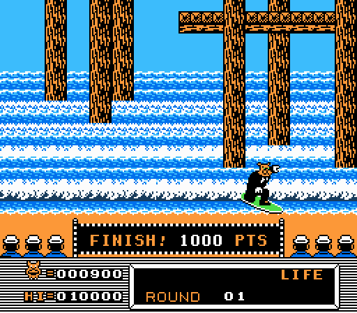 Skating or surfing: pick your metaphorical rage. In each round of surfing, you’re supposed to ride the wave until you see the pier. Once you see the pier, ride towards it and the round is over. Sounds reasonable enough for any large mammal, but keeping the board on the waves is impossible. You’ll either blast your animal forward onto the beach and off the screen or backwards into the deep ocean. Consult the manual, consult an FAQ, memorize the controls, it doesn’t matter. The waves are stronger than the control input. Skating is far more reasonable. Thrash as fast as you can in each round while performing tricks from your limited repertoire. Jumping with your skateboard is your most valuable move. You can grind on fences, hop over obstacles and pits, or launch off of ramps – all for sweet, nourishing points.
