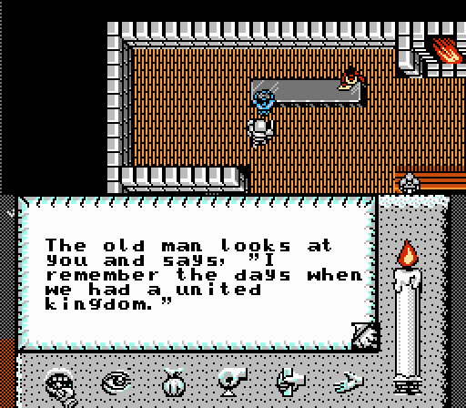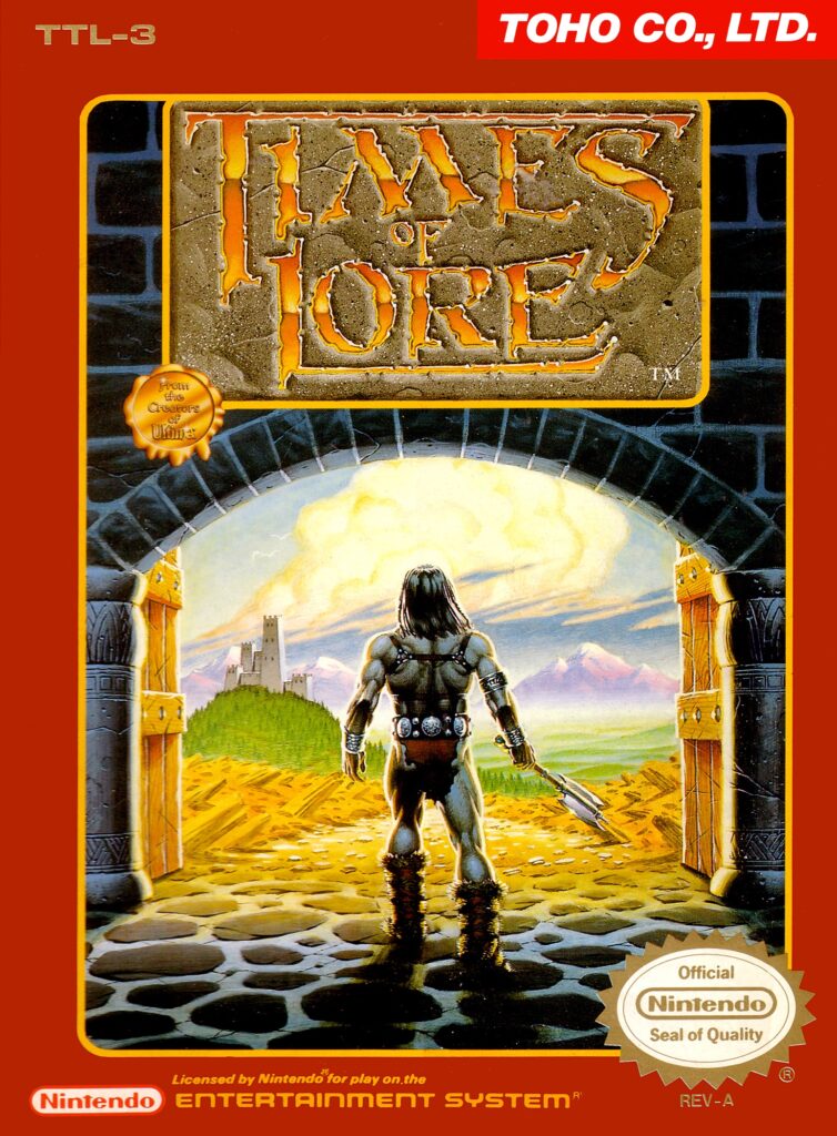 Times of Lore answers the question, “What if the original Dragon Warrior was a non-threatening action-RPG?” You play as a knight, valkyrie, or barbarian who runs errands for powerful citizens of Alberath. A Regent needs you to kill off another Regent who’s threatening his power? Done. Retrieve a chamber pot from an orc camp? Double done. ‘A’ is your attack, while ‘B’ brings up your menu system. It’s a standard self-explanatory menu – speak, give, examine, use, etc. – but, like all late 80s RPGs, feels somewhat stiff and cumbersome. Combat is almost too simple. Orcs, skeletons, wraiths, and spiders are defeated by pressing ‘A’ up against their bodies, unless you have a projectile weapon, like a dagger; usually even that won’t stop them from wanting to give you a kiss ‘neath your helmet grill. There’s no experience points to care about. Combat is only imperative to gather food (which you’ll eat automatically through your journey), green/blue potions, and red/blue scrolls. You can only hold one of each potion or scroll, though, so if you’re loaded up, don’t even bother engaging the enemy; they’ll just slow you down. Music is standard m’lords-and-ladies fare, the graphics are drab, and until you acquire the speed boots from an inn in the middle of the map, controlling your knight is patience-rending. Your character can move at a decent speed without the boots, but if he gets hit by an enemy or runs into a building, he slows down considerably. You’re then forced to build up your speed again, which takes a few seconds of game time. Times of Lore also raises the question, “What is Times of Lore?” The answer won’t hold your interest for long.