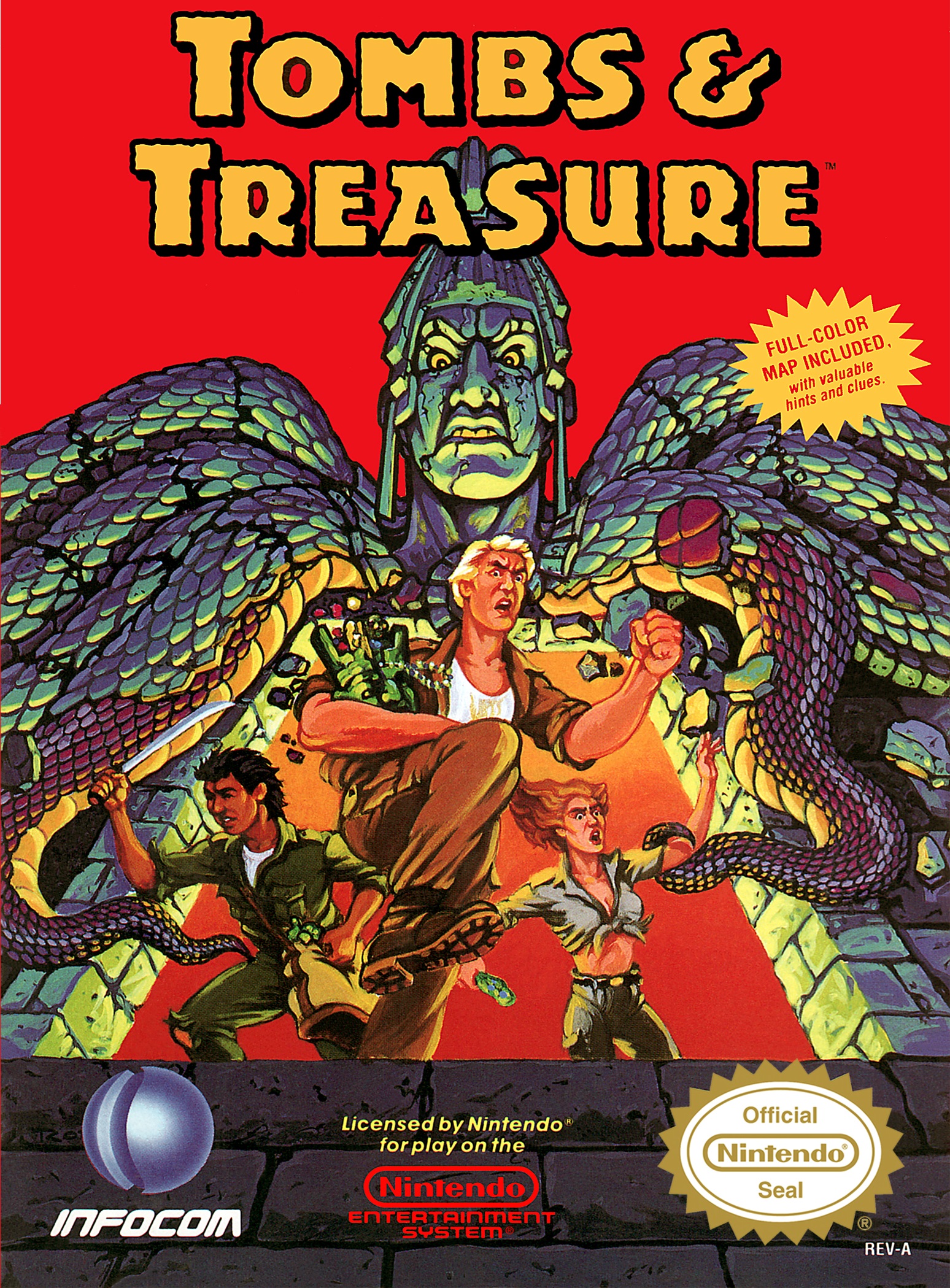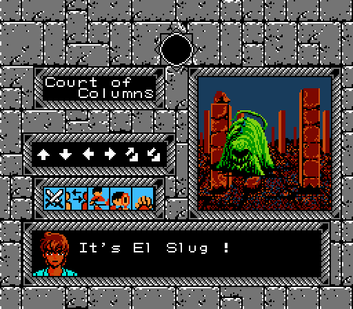 Tombs & Treasure (perhaps the ultimate winning combination) stars a tow-headed young lad and his green-haired girlfriend as they search for clues regarding the disappearance of the lad’s father. Fasten your brain belts: it’s an adventure game. Like Deja’ Vu or Shadowgate before it, no area is free of mystery, no item meaningless, no puzzle solution void of head-scratching. Unlike the aforementioned titles, Tombs tosses in mild RPG elements. Instead of progressing from screen to screen through a menu interface, you walk between different places via an overworld map. Don’t worry about random battles on the map. Battles only take place in certain locations at precise moments (usually when you first enter a new area or after you’ve solved a puzzle). There’s no strategy involved here. Simply select the ‘Fight’ option and hope you’re at a high enough level to kill the monster. If you win, you automatically level up (you also level up when you solve certain puzzles, though the game never tells you when). Solving puzzles is Tombs and Treasure‘s emphasis, and my lands, are they ever vague. Not at first, but later on when you’re trying to figure out why the Golden Globe in El Caracol isn’t making an item appear in the Court of Columns. Wait, I have to use the ‘Wait’ option until enough time passes so the sun hits the Golden Globe, which reflects light off a strange brick in the wall? Wait, those are two different puzzles altogether? Needless to say, an FAQ is essential to enjoying yourself.