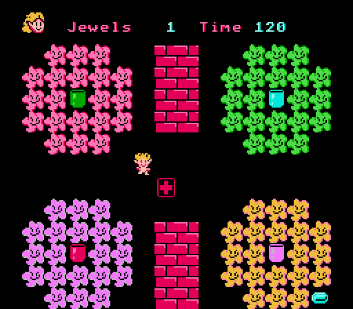 Each of the thirty-two levels has a gimmick: in level 6, for example, there’s only one blue jewel to collect, but there are four different piles of colored gum pieces that surround the color cubes. Your troll’s hair starts off yellow, so deplete the yellow gum pile first. In the middle of the yellow pile is a purple color cube. Dip your hair in the cube, then start depleting the purple gum pile. The purple gum pile has a red cube in its center, and the red gum pile has a blue cube in its center. Deplete all the gum piles until your hair is finally blue, then hit the lone blue jewel and run to the exit. Level 6 is tough, if only because the gum can hurt you if your hair color doesn’t match the gum’s color. But at least if you hurt yourself once, you can heal by touching the Medical cube. Later levels include slippery ice, water which is only crossable with a “sailboat” item, gray cubes that switch your hair to random colors, and often, no Medi-cubes to heal yourself. If you get hit twice, you’re dead, but there are (as far as I could tell) unlimited continues. Trolls might be trying to co-exist with the inhabitants of Treasure Island, but their acceptance doesn’t come easy.