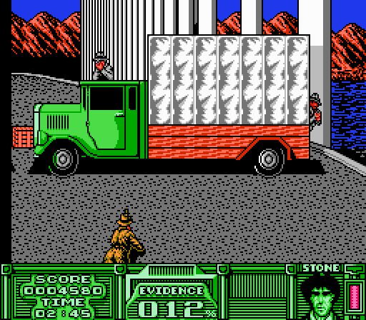The third mission in The Untouchables places you, as Eliot Ness, on the ground in the middle of a gun fight. The level is short by design, only spanning a couple of screens. Ness’ movements are restricted to shooting and rolling across the level. Your objective is to shoot all the bottles you find to “collect evidence.” Each bottle is worth four percent of evidence, so in total, you’ll have to shoot twenty-five bottles to collect a hundred percent of the evidence and complete the level. As you roll and shoot your way along the level, though, only a couple bottles at most will appear. You have to roll back to the very beginning to make bottles re-appear, then roll through the level back and forth multiple times to shoot them all. Meanwhile, Chicago’s finest goons are raining torrents of lead at you, while your life bar drains downwards like a Depression-era paycheck. If you shoot them, you waste time (four minutes on the clock). Strafing while you roll seems like your best option, but it isn’t possible. If Ness dies, he has his unit, Malone, Stone, and Wallace to back him up (read: three extra lives). But even with assistance, the mission is, dare I say, untouchable. Up until this point, Untouchables was an average licensed game, inspiring little emotion. But after grappling with Chicago’s finest police force over what should have been a simple task (all you had to do was shoot bottles and people, gentlemen, both of which you should excel at), I’m surprised Ness made any head way over Capone and his gang. Who needs a drink.