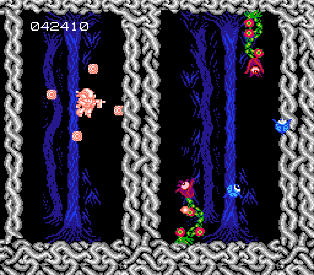 Lag aside, Abadox is a fairly decent, if not straightforward shooter. Like any other standard horizontal shmup, the gameplay is shoot and move. Eyeballs, gaping mouths, and flying skeletons await your lasers, as you guide your hero through mile after mile of intestinal space. It’s surprising that Nintendo let Abadox slide through their, at the time, Gestapo screening process for games. Though no explicit blood spatter is shown (the title screen excepted), entrails and pulsating red intestines don’t exactly scream innocent. Like many ridiculously challenging Nintendo games, I only recommend Abadox if you have some time on your hands because you will die a lot. Judging by the levels I played through, the game is made for you to constantly add new powers to your repertoire. Unlike many shmups, when you gain different powers, you keep them all instead of simply having one. It’s definitely a nice change. Should you die, though, you lose all your upgrades and if you’re in a later level, you need those powers. “Game over” will probably be your road well-traveled. Happy (en)trails.