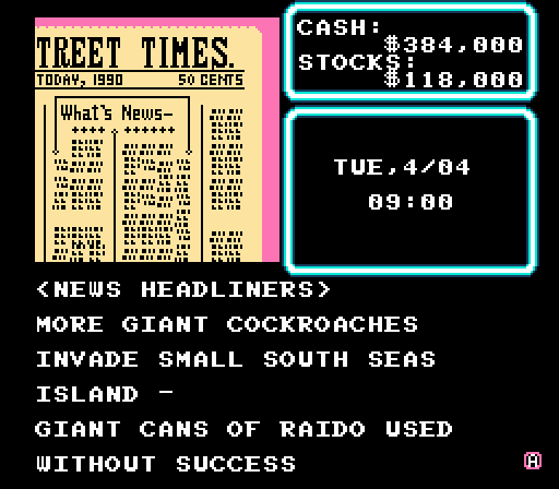 I actually owned this as a kid. My grandmother bought it, and it wound up being one of “her games”, more or less. Not terribly exciting, but surprisingly hard to actually beat, seeing as you need to get basically $1,000,000 in one month, and the game doesn&#039t make that easy to do whatsoever.