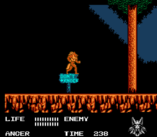 Werewolf: The Last Warrior wants so badly to be your new favorite 8-bit action game; so much so that it’s willing to borrow elements from your other favorite NES action titles in order to win your heart. When you’re in werewolf form, you move and control (and jump spin) like Leonardo in Teenage Mutant Ninja Turtles. You watch exciting cinematics between stages and clutch onto walls a la Ninja Gaiden. The hooded thugs from Rolling Thunder are briefly in one stage. Heck, even the Juggernaut from “X-Men” shows up at one point (though in the game he’s known as the “Iron Head). But even though Werewolf takes from these far superior action games, it also adds new ideas of its own within the Werewolf character. As a werewolf (as opposed to a human, which you transform into if you lose enough health), you can jump higher, grasp onto walls and ceilings, and perform back flips that render the werewolf invulnerable. All of these moves involve a complex control scheme (including a jump function that’s tagged to ‘B’ instead of ‘A’) that will take some time to master. But master you must, and quickly. From the beginning, the short stages are peppered with challenges that require you to think in terms of the character’s abilities, rather than as a straightforward button-mashing action game.