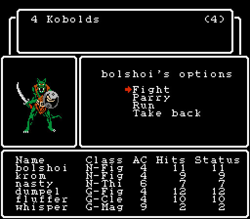 In Wizardry, you make a custom party of up to six characters to explore a ten-level dungeon. There are five races – Human, Dwarf, Elf, Gnome, and Hobbit (!) – and four classes – Fighter, Mage, Cleric, and Thief – to choose from. The balanced party is the best (three fighters, and one Mage, Cleric, and Thief respectively), and six characters from the get-go. Once you’ve bought the appropriate weapons and armor for your party, you’re off into the dungeon. Now, there is no dungeon map, which sounds insane until you remember that Wizardry is an old computer game. If you want to know where you’re going at all times, you’ll have to bust out some graph paper and make maps yourself. Map-making might hit some nerdy sweet spot you didn’t know you had, but if you’re like me, it’s more of a cumbersome chore. Unlike more recent dungeon crawlers that ease you into their labyrinthine structures, Wizardry is difficult from the get-go. Even if you buy the right armor and weapons for your characters, there’s a good chance one or more of your people will die in an early battle because the foes are too strong. You can revive your people at the church for a “small” fee, but sometimes it’s best just to run away if you think there’s a chance of death. Treasure chests are also dangerous: most of them have a trap (which is why it’s always good to have a Thief along), but they’re worth opening for rare items and such. There’s a couple different options to save, but it should be noted that, like most dungeon crawlers, you can’t actually save in the dungeon.