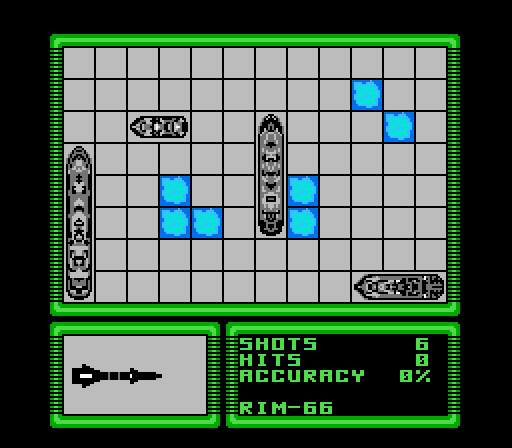 Battleship is an almost exact replica of the board game. You aim a target over any number of blue squares (representing water, I suppose), fire your missile, and then the game zooms in on a targeted ship. Your missile will either hit it or fly right over it. The computer takes its turn, they hit your ship, and you die a little inside. It’s hard getting through one mission, but there’s forty missions in the game. Think it might be tolerable playing with a friend? Sadly, there’s no two-player mode, and as previously implied, the computer is a cheap, difficult, hideous mistress. For some reason, Milton Bradley took out the numbers and letters. My guess is they removed them to make the game more realistic, but Battleship already fires on Geo Metro cylinders anyway; not sure why they bothered. To add “depth” to the game, your different ships can fire missiles in varying patterns. For example, a battleship might be able to fire a 4X4 grid of missiles, whereas a little cruiser can only fire one missile. You have a limited number of these special extra attacks, so really make ’em count. Or, you know, turn off the game.