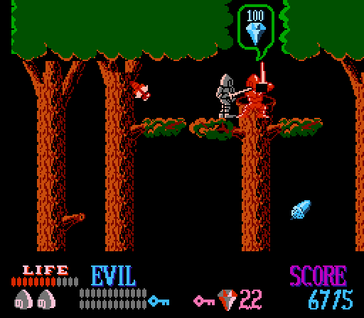 If you were a knight at the dawning of the age of Aquarius, you might act a little like Kuros, the star of Wizards & Warriors. He’s loopy, and he can’t hold a sword properly, but he still gets his share of knighting done. Kuros wanders through forests, ice and fire caves, more forests, and a large castle for the reward of half-naked princesses aplenty. The worlds he wanders are “non-linear,” which means, his journey isn’t a mere left-to-right affair. Each world requires precise jumps (lots of ’em!), an array of hidden items, keys of varying colors, and gobs of gems to conquer. A red, blue, and pink key are hidden throughout each world. Once collected, they open up treasure chests of the same color. The treasure chests give either gems, which bribe the knight at the end of each stage; or special items like “The Feather of Feather Fall,” which allows you to float gently down if you fall off a ledge. Each world takes a goodly amount of time to explore its depths and intricacies. Fear not: there’s no time limit, you have unlimited continues, and you restart right where you die every time. Wizards & Warriors was quite the generous game in 1987. Two complaints: enemies are numerous and belligerent, attacking you with every ounce of strength and hostility within their bones; and the level design feels sloppy and unrefined compared to Nintendo’s own non-linear adventure Metroid, released the year prior. Nevertheless, gathering treasure and saving ladies proves addicting enough to hold one’s attention throughout the adventure. You and Aquarius win this round, Kuros.