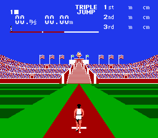 Stadium Events and World Class Track Meet are the exact same game, save for the title screen logo and some other minor changes. As such, they can be reviewed as one game, making my quest that much less of a fiscal burden. First: you need the Power Pad for World Class. Yeah, you can emulate, but pumping your keyboard with two fingers doesn’t compare to the blood, sweat, and more sweat that is the full experience. The twelve-buttoned Side B is what you’ll use, despite the fact that World Class is only controlled with two buttons. You and a friend can compete side by side, and up to six people can play through the events. Only two people can compete at a time, however. Your personal space bubble won’t be popped, and your Power Pad will thank you.