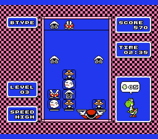 Given the quality of Yoshi though, I’d say Luigi got the better deal. The game isn’t much more than a Tetris clone featuring Yoshi eggs and Bowser’s lackies. Once you start, notice that the playing field has four columns. Boos, Goombas, Piranha Plants, and Bloopers will emerge from these columns, though they only fall two at a time. Once they land on one of four tiles at the bottom of the screen, they turn into blocks. When two of the same enemy blocks touch each other, the blocks disappear. You control Mario below the tiles, and your job is to position the blocks under the columns with the appropriate falling enemies, so that the blocks will disappear faster. Broken pieces of Yoshi eggs will also occasionally fall from the columns. The top half of the eggshell will disappear once it touches anything, but the bottom half will land like any other enemy block. Once the bottom half has landed, fill it up with random enemy blocks. Then, when a top half emerges, place the top half on the top of the stack with the bottom eggshell. It will swallow up the enemy blocks, connect the eggshell, and pop out a Yoshi. It’s cute the first couple times it happens (the more blocks you have under the egg, the bigger your Yoshi will be), and it also nabs you some extra points. After birthing a handful of Yoshis on the backs of baddies, you’ll ask yourself, is this it?