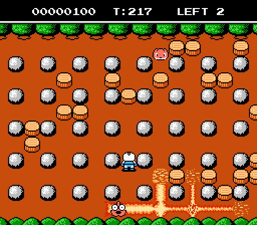 But hey, I gave the first Bomberman an “A-” for being a simple run-and-bomber, with subtly addictive gameplay, so surely more of the same is good, right? Yes, more of the same would have been fantastic, but the little changes Hudson Soft added are weird and, strangely, make the game not as memorable. The enemies, while bizarre in the first game, were endearing, and there was a balanced mix between enemies that could float through blocks and those that couldn’t. In BM II (heheh), about 60-70% of the enemies can fly through blocks, which increases the maximum amount of needless deaths. It doesn’t help that the AI is a lot cheaper: sometimes you’ll be trapped between two blocks at the beginning of the level, and a couple enemies will fly through the blocks and kill you before you have time to escape. The enemy designs could use some tweaking too: what’s with the smiling baby blue dragons straight out of “The Land Before Time”? Also, it takes a lot longer to build up your bomb arsenal in this game. Many of the new power-ups – like invincibility from enemies or fire – are only good for the level, unlike BM 1 where every power-up helped you for good (save the timer, of course). Either that, or the power-ups don’t help you at all – thank God for that extra time that I didn’t need! Unlike the first game, there is a battle mode where you can duke it out with other Bombermen if you wish, but there’s something lacking in two or three-player Bomberman; namely, extra players. Also, no one actually owned an NES multitap, so I’m pretty sure if no one owns a peripheral, it doesn’t really exist.