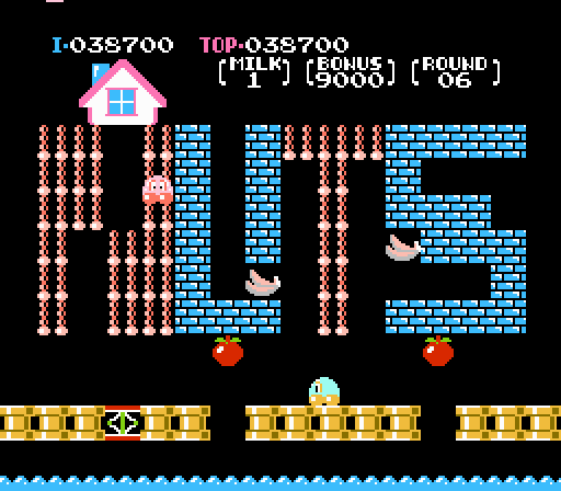 Nuts & Milk is a simple, strange arcade game that is, unfortunately, remembered more for its ridiculous title than its amusing gameplay. You star as Milk, a pink mushroom creature who has to rescue his fiancée from the treacherous grasp of Nuts and his evil blimps (yes, Nuts & Milk was only released in Japan). Collect pieces of fruit strewn about to open the path to Milk’s beloved, and progress to the next level. The level design is simple, clean, and colorful. Ropes, pipes, and bricks are the main ingredients used to construct each level, and nothing – not the fruit or the bouncing platforms or even Nuts himself – is out of place. Avoiding Nuts in each level isn’t too great a task. He copies your moves verbatim or simply chases you outright, but thankfully, he’s a lot dumber than you. If you’re on the opposite side of a chasm, Nuts will not use the bouncing platform to jump over the chasm and kill you. He’ll jump towards you and fall right into the chasm; this is one of several examples of Nuts’ idiocy. Unfortunately for Milk, Nuts always regenerates after he dies, and often in an area near fruit. Don’t neglect his persistence and always find his regeneration spot; the latter is different in every level. Collecting fruit, avoiding Nuts (or sometimes Nutses), and rescuing your bride-to-be. It’s a shame that Hudson Soft or Nintendo failed to see this game’s potential outside Japan. Nuts & Milk is a gentle, whimsical game that would have found an appreciative audience in the States.